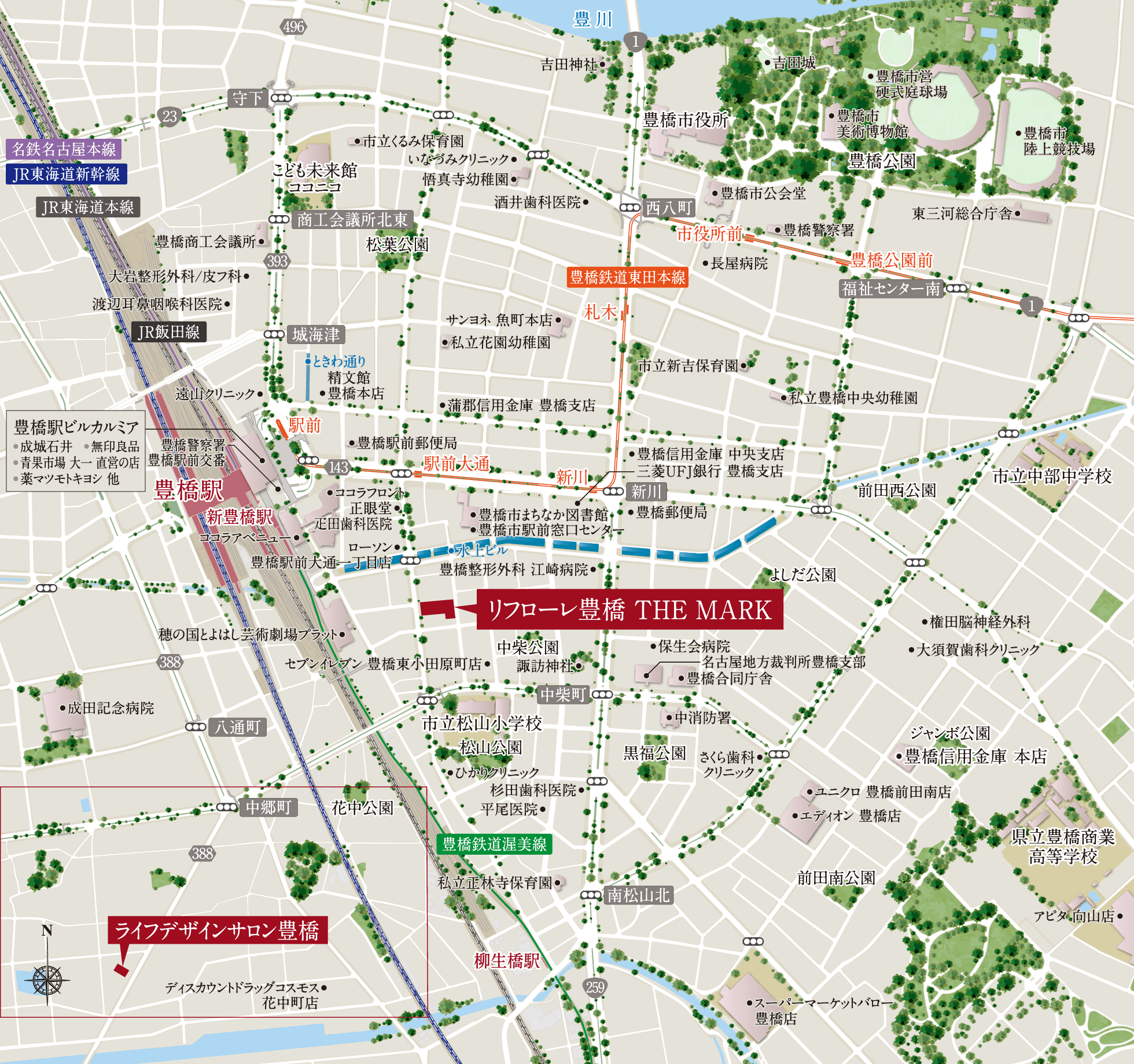 ※各種施設は2024年10月現在のものであり、将来にわたってその所在、営業が保証されるものではありません。また、保育園及び幼稚園などの教育機関は周辺の環境施設の情報として記載をしており、各種施設への入園や入学を保証するものではありません。※地図は略図のため省略されている道路があります。方位記号は若干誤差があります。予めご了承ください。