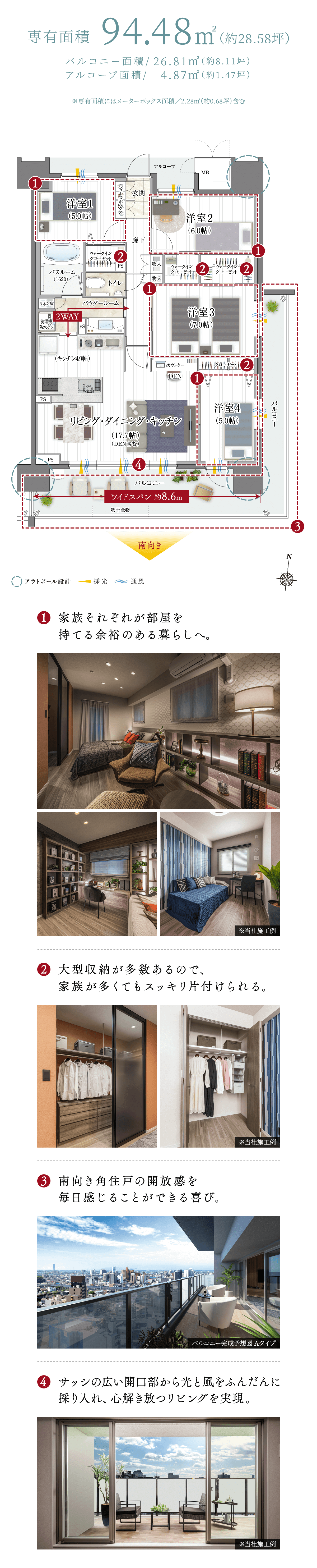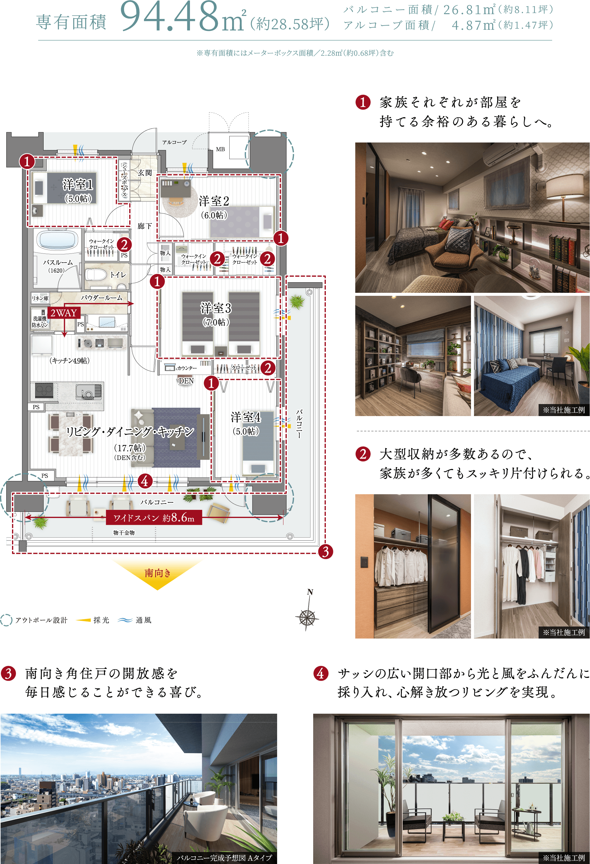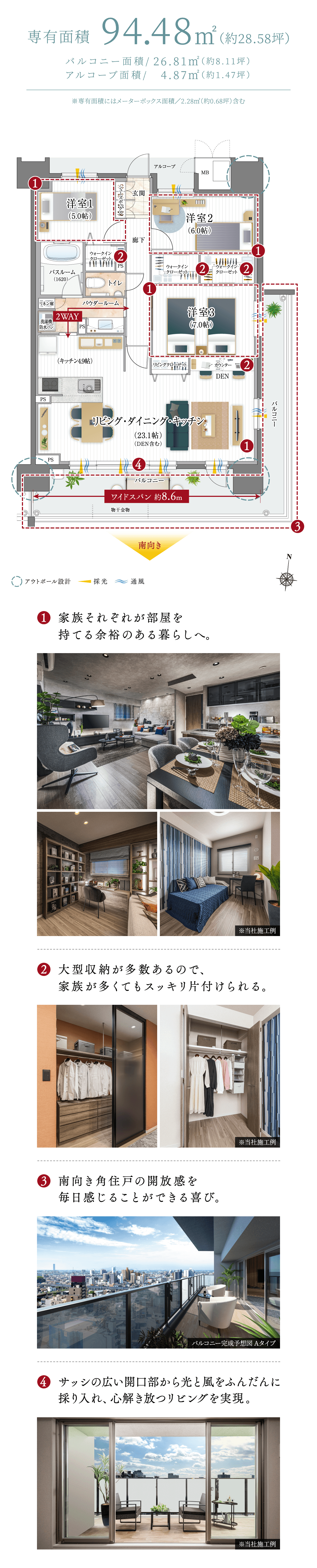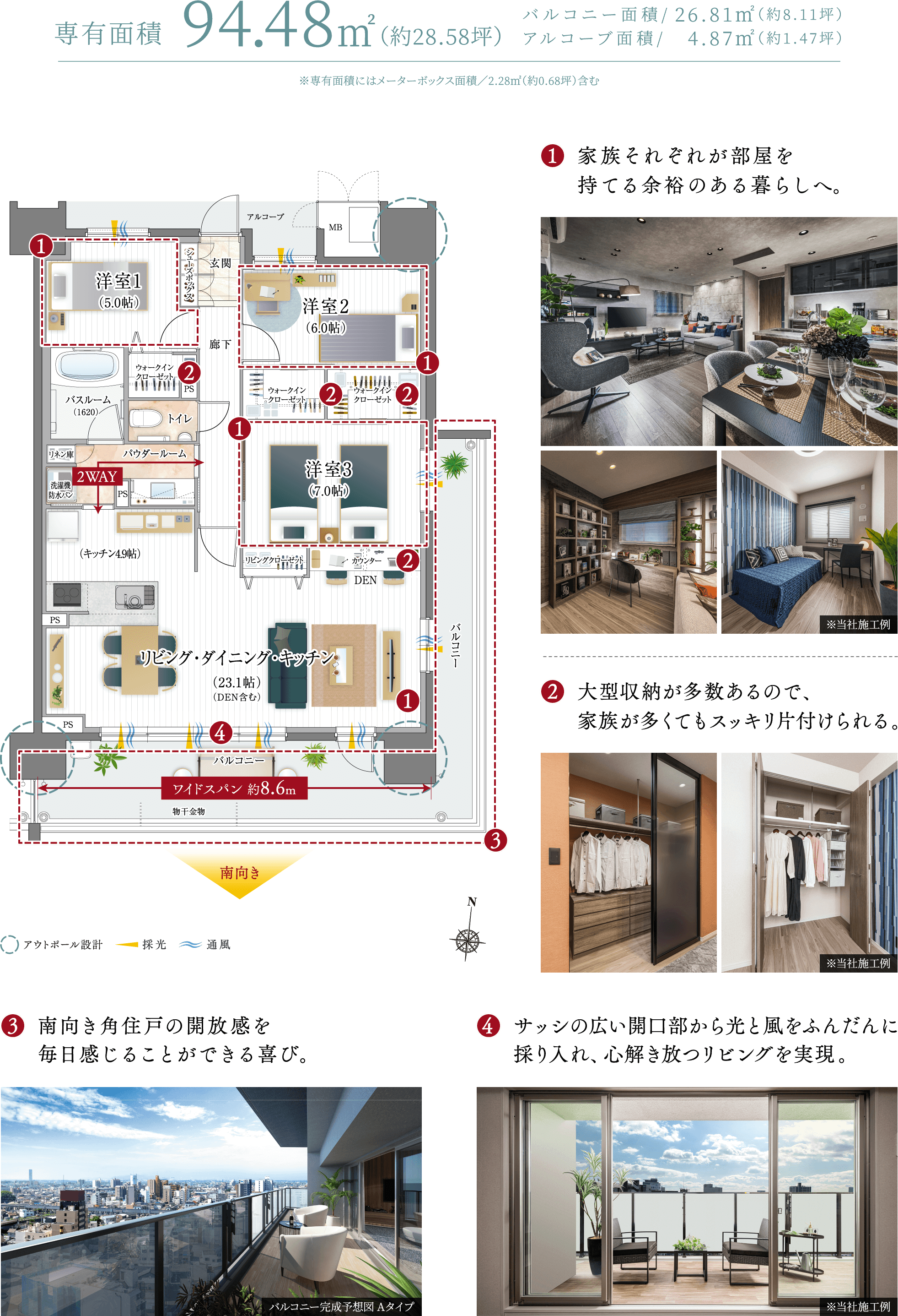 ※バルコニー完成予想図は2024年9月に現地15階相当から撮影した眺望写真に計画段階の図面を基に描いたバルコニーをCG合成したものです。外観・外構・色彩等は実際とは異なります。形状の細部・設備機器・配管類等は一部省略又は簡略化しております。タイルや各種部材につきましては、実際と質感・色等の見え方が異なる場合があります。行政官庁の指導、施工上の都合及び改良のため、設計・仕様・外構工事等に変更が生じる場合があります。※住戸によって眺望は異なります。また将来にわたって保証するものではございません。※完成予想図内の家具や調度品はイメージです。実際とは異なる場合がございます。家具・調度品は販売価格に含まれておりません。※掲載の写真は2024年10月にライフデザインサロン豊橋内サンプルルームを撮影したものです。一部オプションや設計変更(有償)が含まれております。(一部弊社既存サンプルルームを含みます。)家具・調度品は販売価格に含まれておりません。※建具や家具等の色調は、印刷物のため実際とは異なる場合がございます。※一部メーカー支給の参考写真·イメージ画像を使用しています。予めご了承ください。