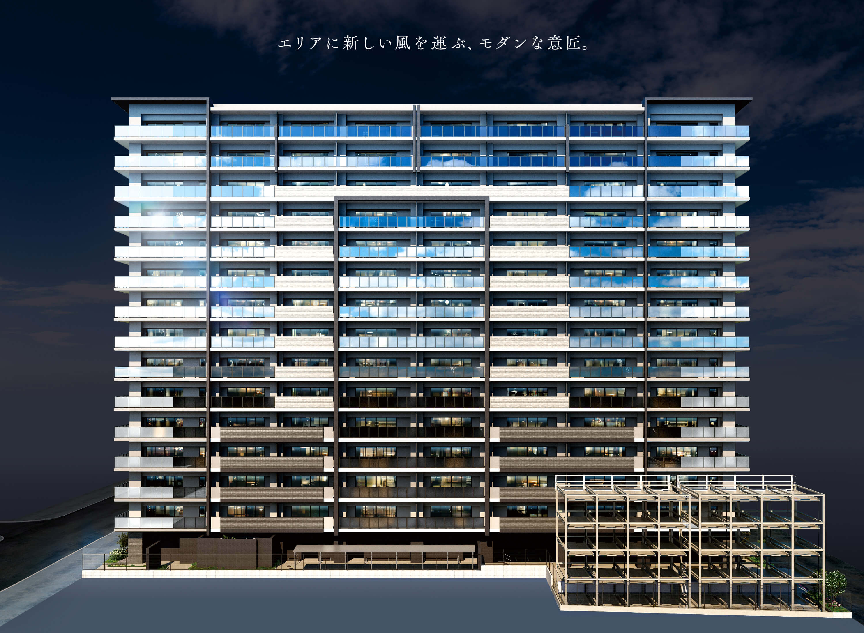 112戸もの大規模マンションとしての存在感を意識し、街のランドマークとなるよう黒やグレーの威厳ある配色を採用。また両サイドにマリオンを設けることで、エリアの中で際出つようなデザインに仕上げました。
